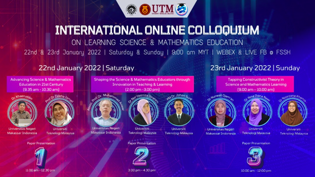 MAKASSAR, KACE — Fakultas Matematika dan Ilmu Pengetahuan Alam (FMIPA) Universitas Negeri Makassar (UNM) melaksanakan International Online Colloquium bersama Universiti Teknologi Malaysia (UTM), Sabtu-Minggu (22-23/01/22). Kegiatan ini diselenggarakan untuk mendiskusikan hasil penelitian terkini dalam bidang pendidikan Matematika dan Ilmu Pengetahuan Alam.