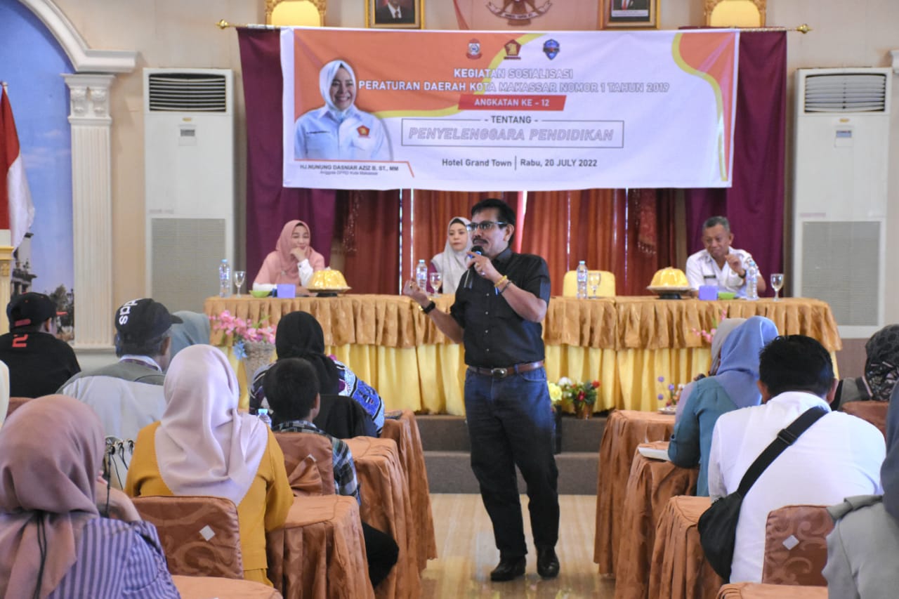 MAKASSAR, KACE — Kepala Humas Insitusi Universitas Negeri Makassar (UNM) Dr. Burhanuddin menjadi pembicara dalam sosialisasi peraturan daerah (Perda) no 1 tahun 2019 Kota Makassar terkait penyelenggaraan pendidikan.