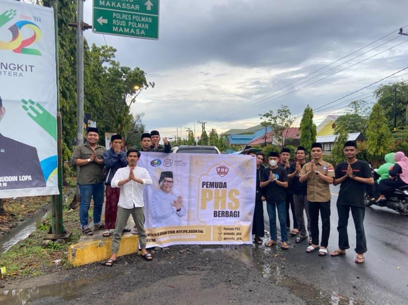POLMAN.KACE — Sekelompok Pemuda di Kabupaten Polewali Mandar (Polman) yang tergabung dalam Pemuda Prof Husain Syam (Pemuda PHS) membagikan takjil di depan Masjid Agung Syuhada, Jalan Poros Majene-Polman, Sabtu, 30 April 2022.
