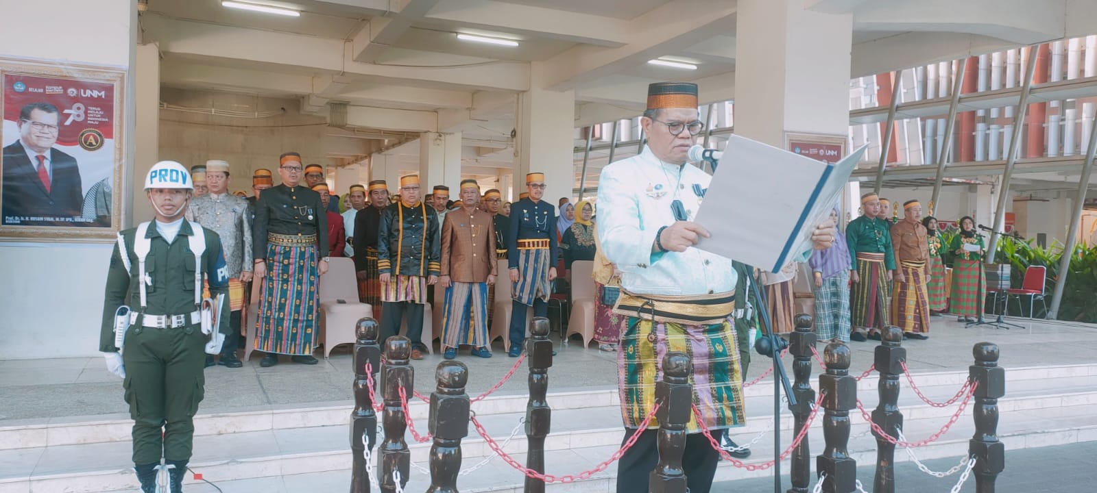 Pada kesempatan tersebut, Rektor UNM, Prof Husain Syam bertindak sebagai pembina upacara mengenakan pakaian adat diikuti oleh para Wakil Rektor, Dekan, pejabat lingkup UNM serta civitas akademika.