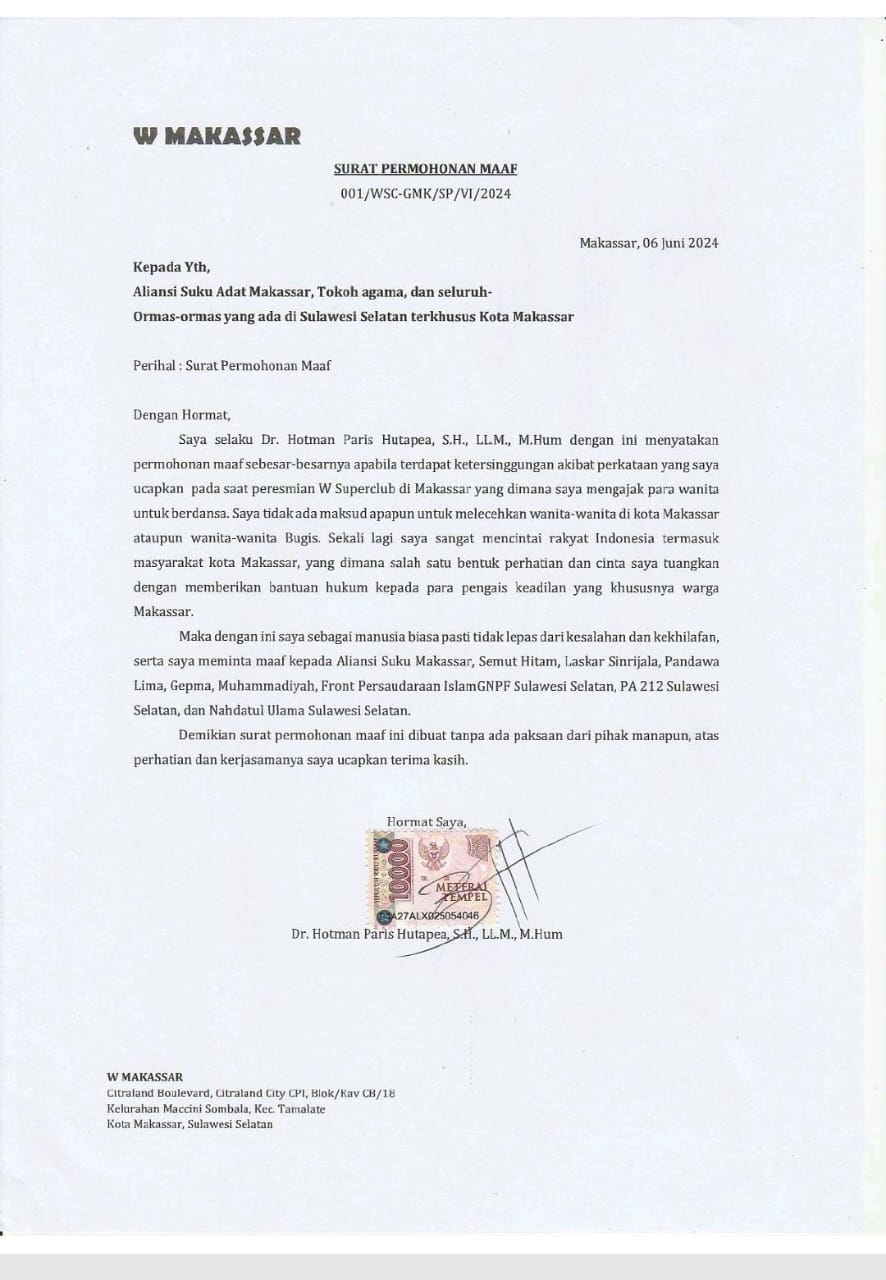 MAKASSAR, KACE — Pengacara kondang Hotman Paris Hutapea menulis surat terbuka sebagai permohonan maaf kepada warga Sulawesi Selatan, khususnya Makassar atas pernyataannya yang dianggap kontroversial saat meresmikan W Superclub di CPI pada 27 Mei lalu.