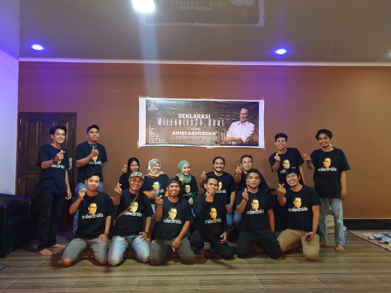 BONE.KACE — Deklarasi dukungan pemuda kepada Anies Baswedan For Presiden 2024 terus berdatangan. Kini giliran jaringan Mileanies24 Bone menggelar deklarasi di Rumah Kreatif Pemuda Watampone Minggu 06/03/2022.Melalui deklarasi tersebut Koordinator Daerah Mileanis24 Bone, Nasrul Iswadi Bundu menyerukan agar semangat perjuangan pemuda di Kabupaten Bone harus terus bergolak menatap Pilpres 2024.”Kami millenials24 Bone dengan ini menyatakan mulai detik ini tanggal 06 Maret 2024 meminta Bapak Anies Baswedan meneruskan perjuangan kita. Sejarah panjang kaum muda yang turut andil merebut kemerdekaan harus terus bertumbuh, menggenggam tampuk kepemimpinan nasional mengisi cita kemerdekaan yang tak kunjung selesai”, tegas Nasrul dalam deklarasinya.Selesai deklarasi Nasrul menyampaikan telah mempersiapkan beberapa agenda gerakan selanjutnya, menyasar underground dan pelosok.