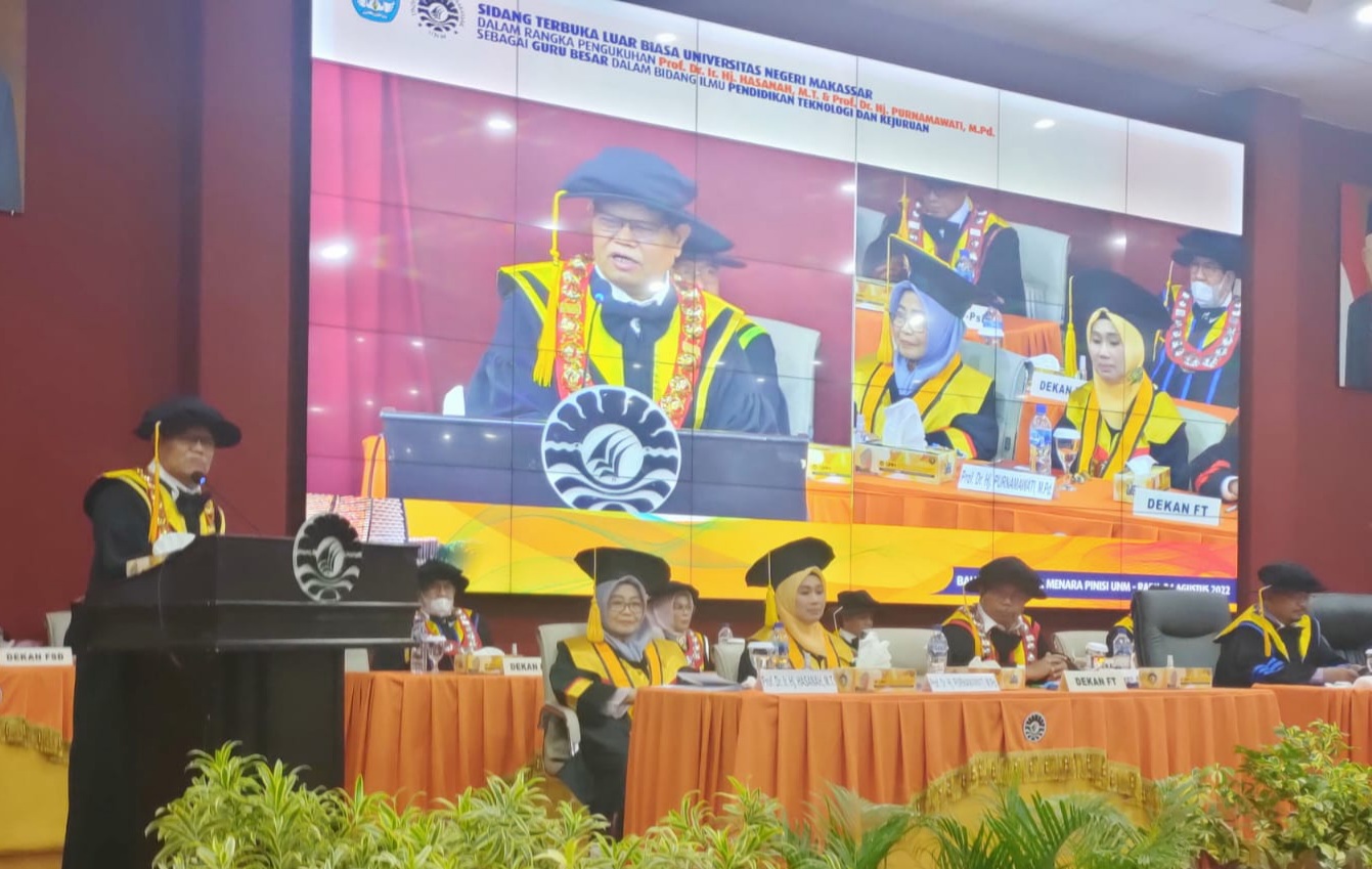 MAKASSAR, KACE — Universitas Negeri Makassar (UNM) mengukuhkan dua profesor sebagai guru besar dalam bidang ilmu pendidikan teknologi dan kejuruan di Menara Pinisi, Rabu 24 Agustus 2022. Mereka adalah Prof. Dr Purnamawati, M.Pd dan Prof. Dr. Ir Hasanah Nur, M.T. Sehingga saat ini UNM telah memiliki 99 guru besar.